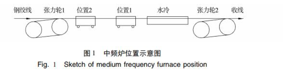 預應力混凝土鋼絞線(xiàn)生產(chǎn)中,鋼絞線(xiàn)穩定化處 理生產(chǎn)線(xiàn)使用的中頻感應加熱爐為移動(dòng)式( 如圖 1 所示) 。生產(chǎn)線(xiàn)停止運行時(shí)中頻感應加熱爐處于位 置 1,生產(chǎn)線(xiàn)啟動(dòng)運行時(shí)中頻感應加熱爐由位置 1 向與穩定化處理鋼絞線(xiàn)反方向移動(dòng)至位置 2,生產(chǎn) 結束時(shí)中頻感應加熱爐由位置 2 移動(dòng)至位置 1。正 常生產(chǎn)中鋼絞線(xiàn)經(jīng)中頻感應加熱爐加熱后進(jìn)入生產(chǎn) 線(xiàn)冷卻水槽( 圖 2) 冷卻,再經(jīng)壓縮空氣吹干。生產(chǎn) 線(xiàn)停止運行時(shí),在中頻感應加熱爐由位置 2 移動(dòng)至 位置 1 過(guò)程中,其兩端自帶的冷卻與吹干裝置自動(dòng)啟動(dòng),對位置 2 與生產(chǎn)線(xiàn)冷卻水槽之間的部分鋼絞 線(xiàn)進(jìn)行冷卻、吹干處理,從而使這部分鋼絞線(xiàn)與正常 生產(chǎn)的鋼絞線(xiàn)性能一致,以降低消耗,提高鋼絞線(xiàn)的 成材率。