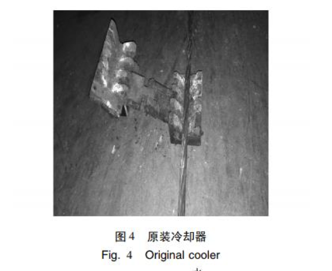 長(cháng)期生產(chǎn)運行中,發(fā)現中頻爐兩端原 裝的冷卻裝置冷卻效果不佳,既影響產(chǎn)品質(zhì)量,又易 造成鋼絞線(xiàn)整根斷裂,存在極大的安全隱患,對人身 和設備造成傷害。 正常生產(chǎn)的鋼絞線(xiàn)經(jīng)冷卻后溫度不高于 60 ℃[4],而經(jīng)中頻爐自帶的冷卻裝置一次自動(dòng)冷卻后 的鋼絞線(xiàn)溫度仍然過(guò)高,約 150 ℃ 左右[5],如果此 時(shí)生產(chǎn)線(xiàn)啟動(dòng),將對此部分鋼絞線(xiàn)進(jìn)行二次加熱,由 于溫度疊加,造成溫度急劇上升,使鋼絞線(xiàn)加熱溫度 過(guò)高,在 30% ~ 50% 抗拉強度的張拉力作用下易造 成鋼絞線(xiàn)整根斷裂。為避免此現象發(fā)生,必須由人 工操作,將中頻爐在位置1 與位置2 之間行走2 至3 次,才能將鋼絞線(xiàn)的溫度降至 60 ℃以下。這樣操作 既浪費時(shí)間也降低生產(chǎn)效率。而且由于需要反復多 次冷卻,中頻爐冷卻器、吹干器等相關(guān)部件使用頻次 增加,維護成本提高。 經(jīng)反復查找,發(fā)現中頻爐原裝的冷卻裝置( 圖 3) 冷卻效果差與其冷卻器( 圖 4) 有關(guān),原設計冷卻器與吹干器為銅制合頁(yè)式交錯咬齒形結構,該設計 存在以下問(wèn)題: ( 1) 采用噴淋式冷卻,冷卻面積小。 ( 2) 冷卻器短,長(cháng)度只有 135 mm。 ( 3) 冷卻水流量小,只有 16 個(gè)直徑為 1 mm 的 出水口。 ( 4) 冷卻器數量少,受設備總體布局的約束,中 頻爐兩端分別有一個(gè)冷卻器。 ( 5) 工作環(huán)境高溫、高油煙,冷卻器出水孔易堵 塞,不能正常工作。 ( 6) 生產(chǎn)線(xiàn)停止運行時(shí),中頻爐由位置 2 向位 置 1 移動(dòng)過(guò)程中,由于鋼絞線(xiàn)沒(méi)有張力,受重力作用 鋼絞線(xiàn)自然下垂造成冷卻器磨損。由于冷卻器結構 復雜難加工,因此制造成本高。